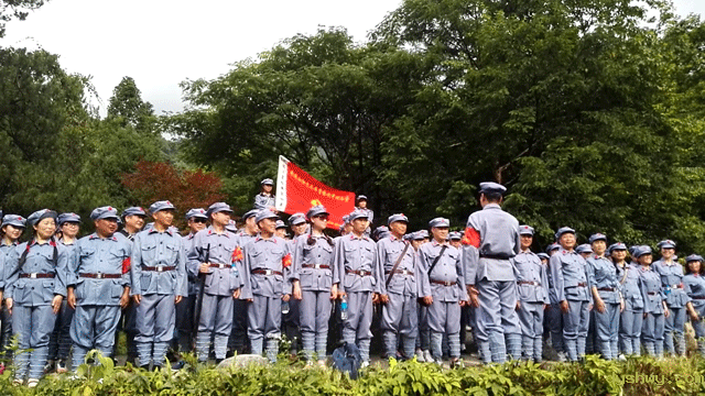 毛泽东宣布三大纪律遗址——荆竹山雷打石,全体学员分成两个纵队,身穿红军衣,头戴八角帽,高举“中国工农红军”的旗帜,以整齐的步伐、规范的军姿、响亮