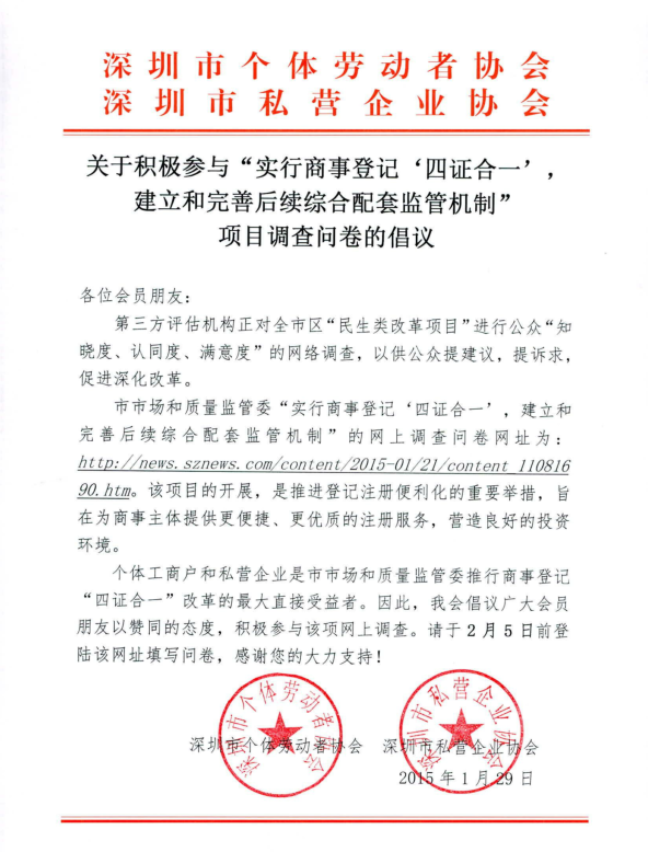 关于积极参与“实行商事登记‘四证合一’,建立和完善后续综合配套监管机制” 项目调查问卷的倡议