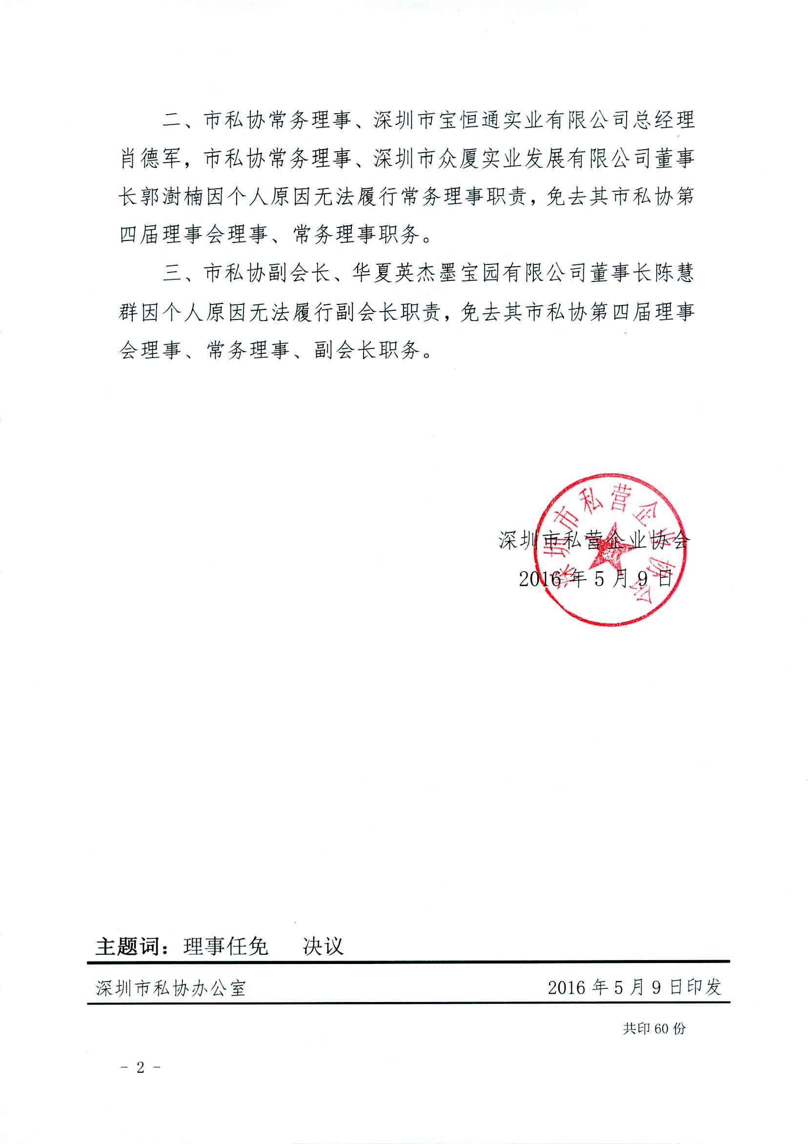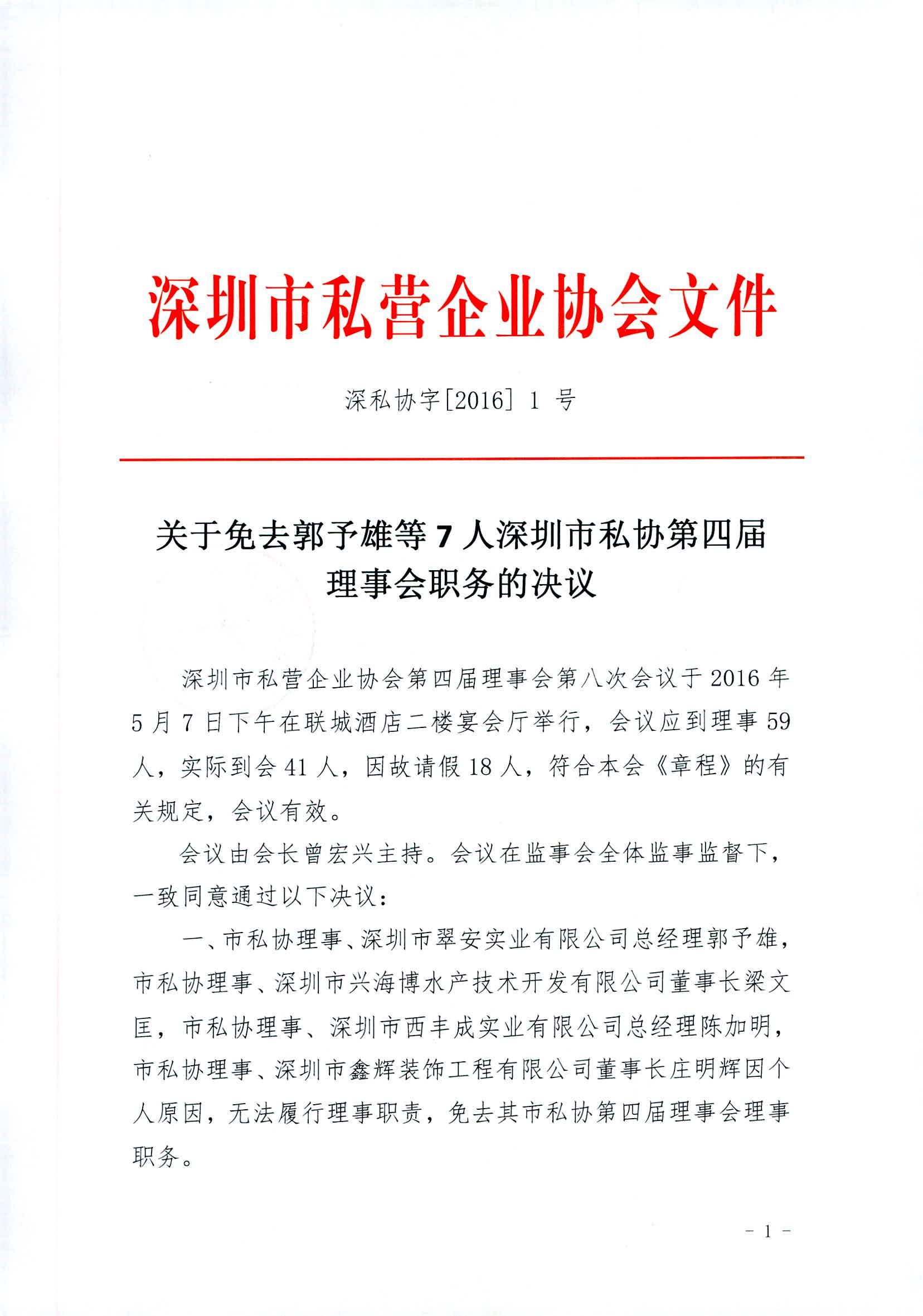 深私协字【2016】1号关于免去郭予雄等7人深圳市私协第四届理事会职务的决议
